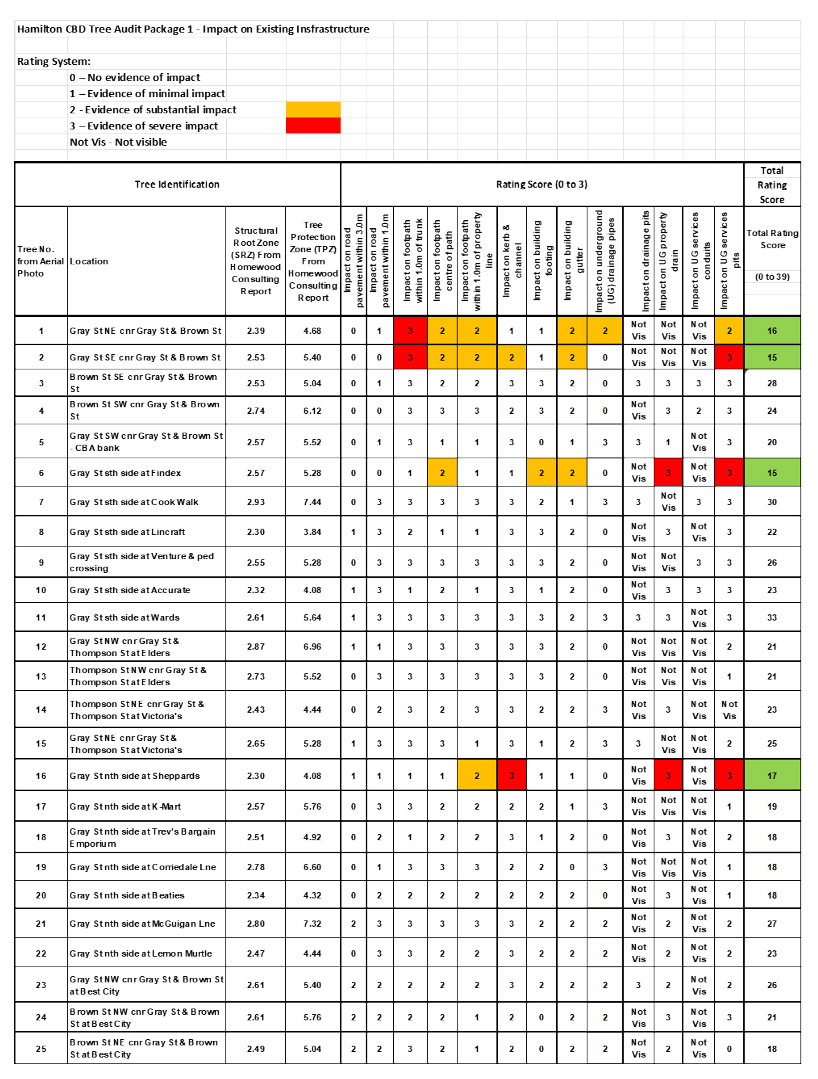 A tree audit commissioned for Stage 1 found all 25 trees caused significant damage, with impact scores of 15 to 33 out of 39, showing even the least problematic trees posed substantial infrastructure risks.