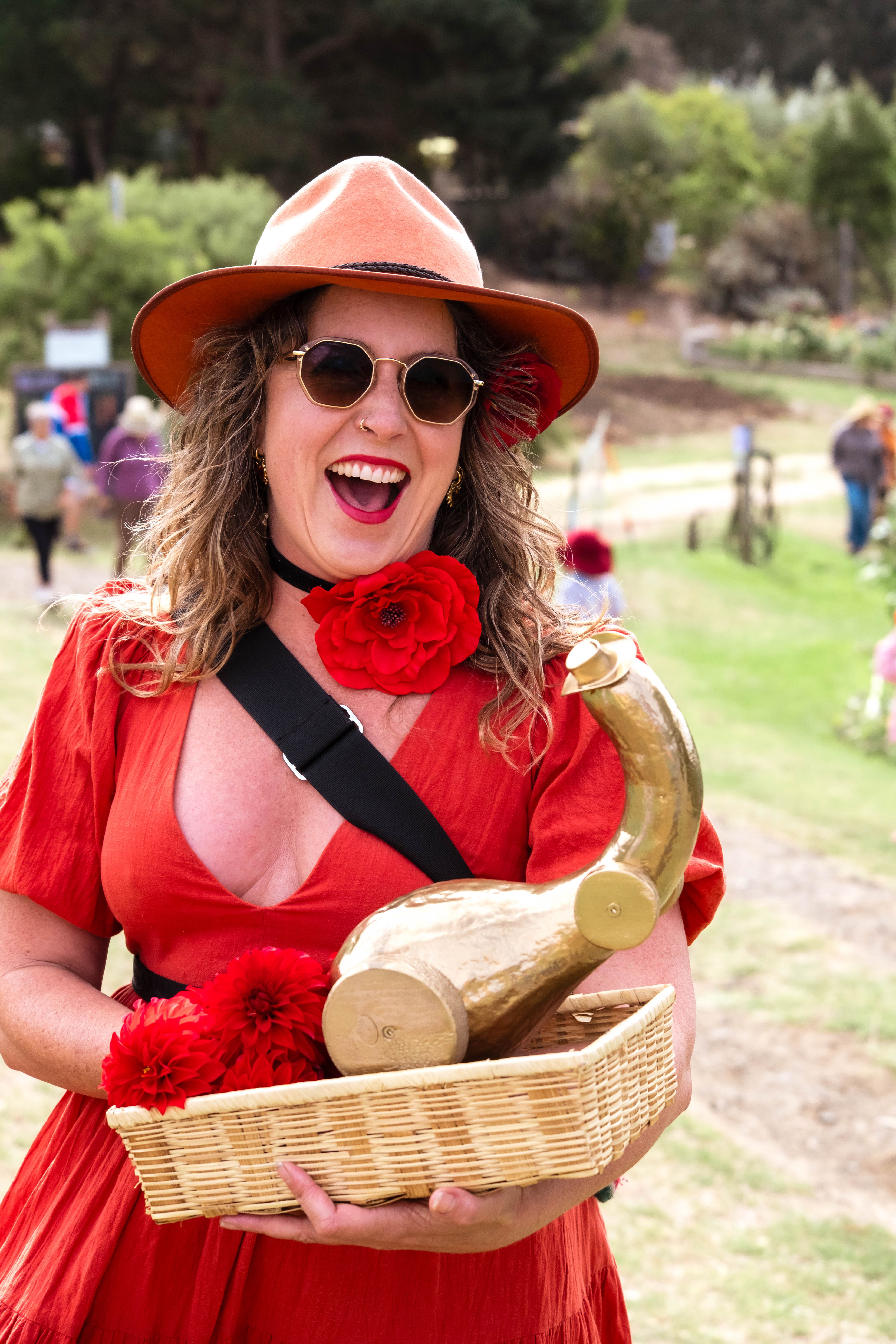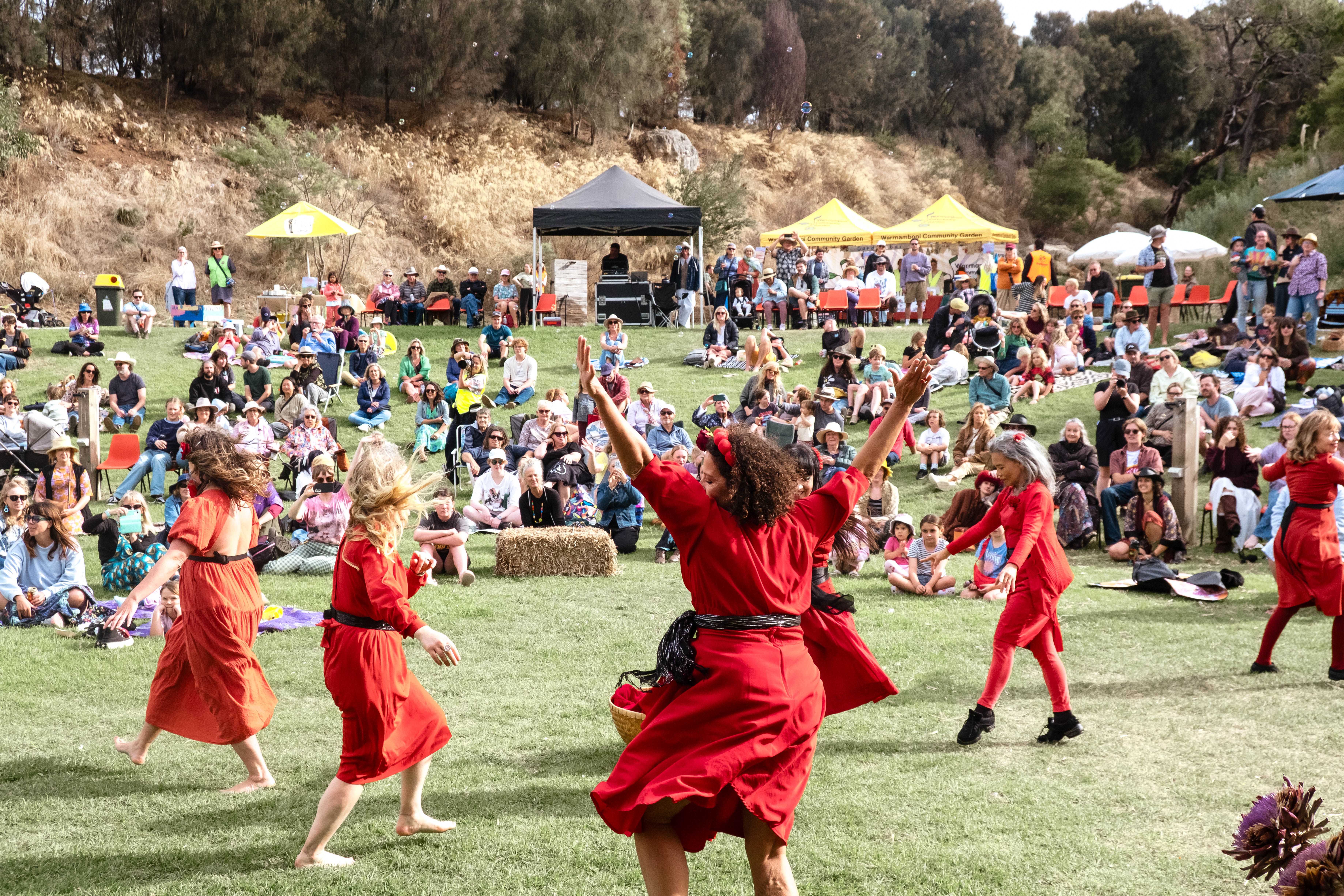 Between sets by local bands, a red flashmob of Kate Bush lookalikes performed a Wuthering Heights dance for the crowd.
