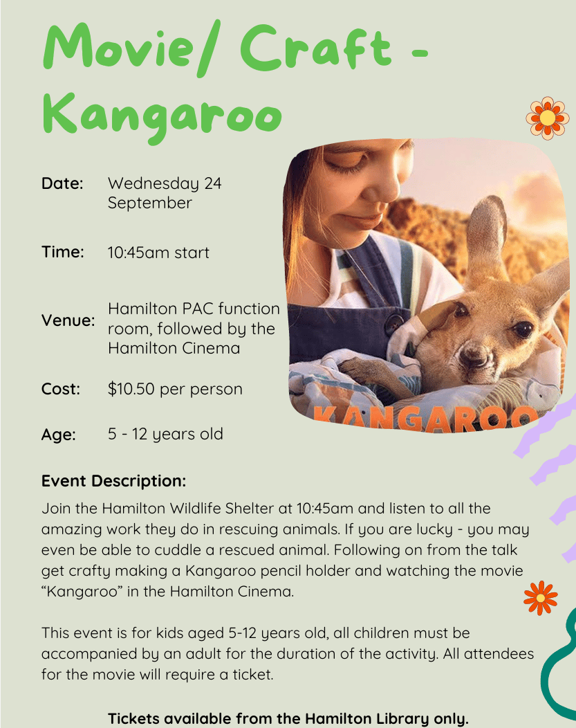 Join the Hamilton Wildlife Shelter for a presentation about the work they do in rescuing animals. You may even be able to cuddle a rescued animal. Following on from the talk, kids can make their own Kangaroo pencil holder and watch the movie Kangaroo in the Hamilton Cinema.