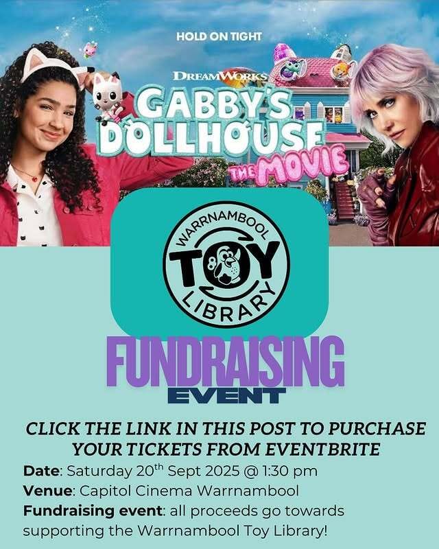 Head to the Capitol Cinema Warrnambool on the first day of school holidays for a special screening of Gabby's Dollhouse: The Movie. Proceeds from this event will go towards supporting the Warrnambool Toy Library.